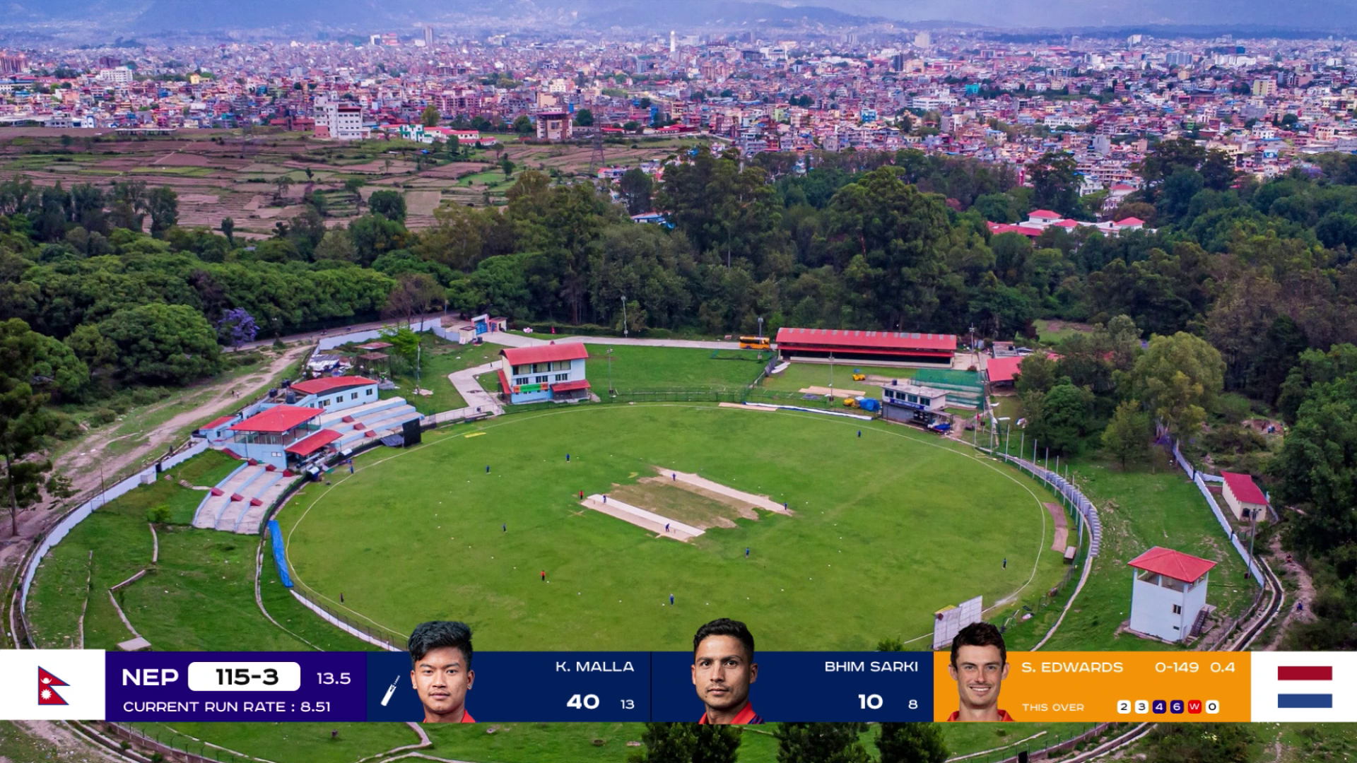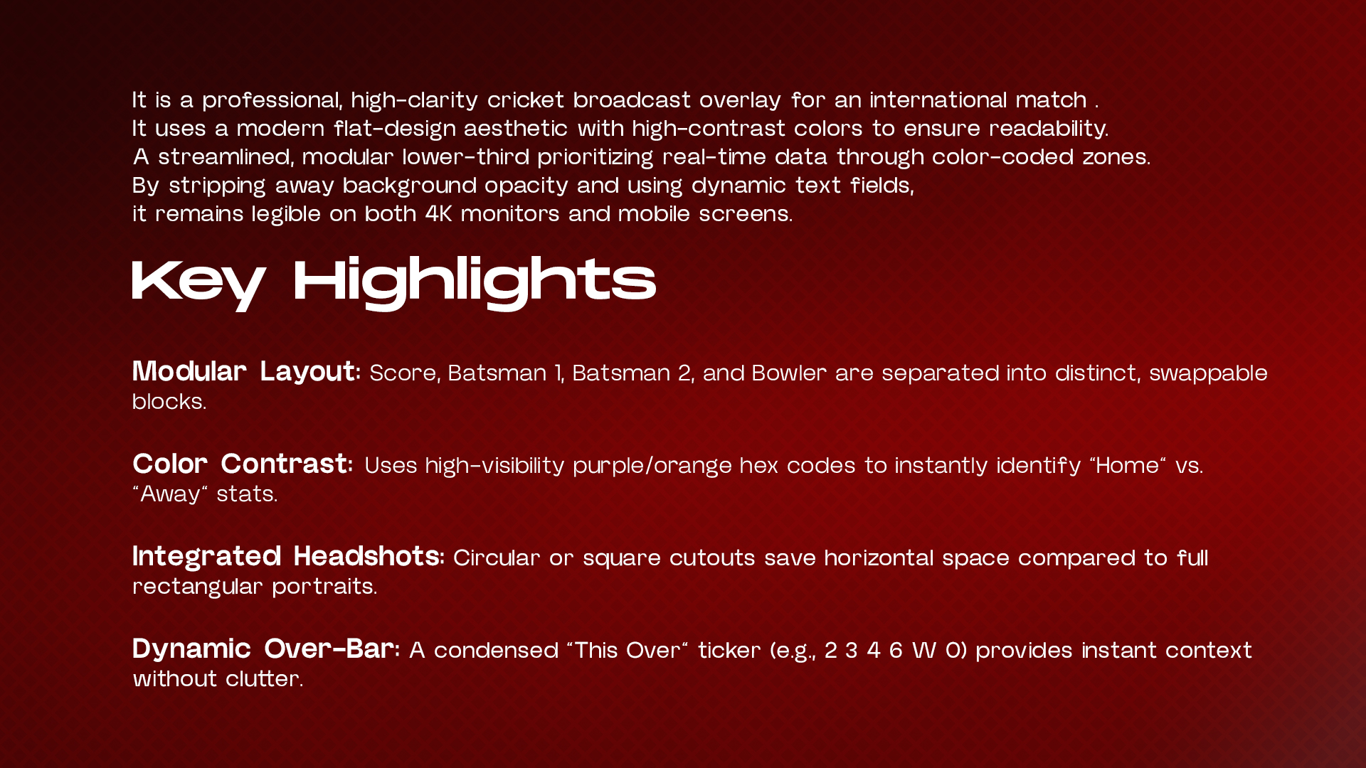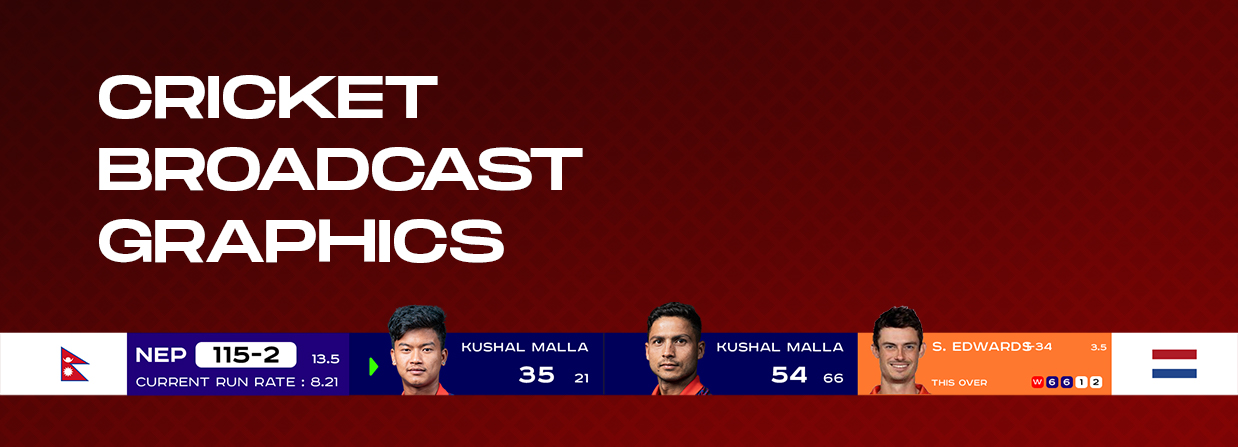 It is a professional, high-clarity cricket broadcast overlay for an international match . It uses a modern flat-design aesthetic with high-contrast colors to ensure readability.